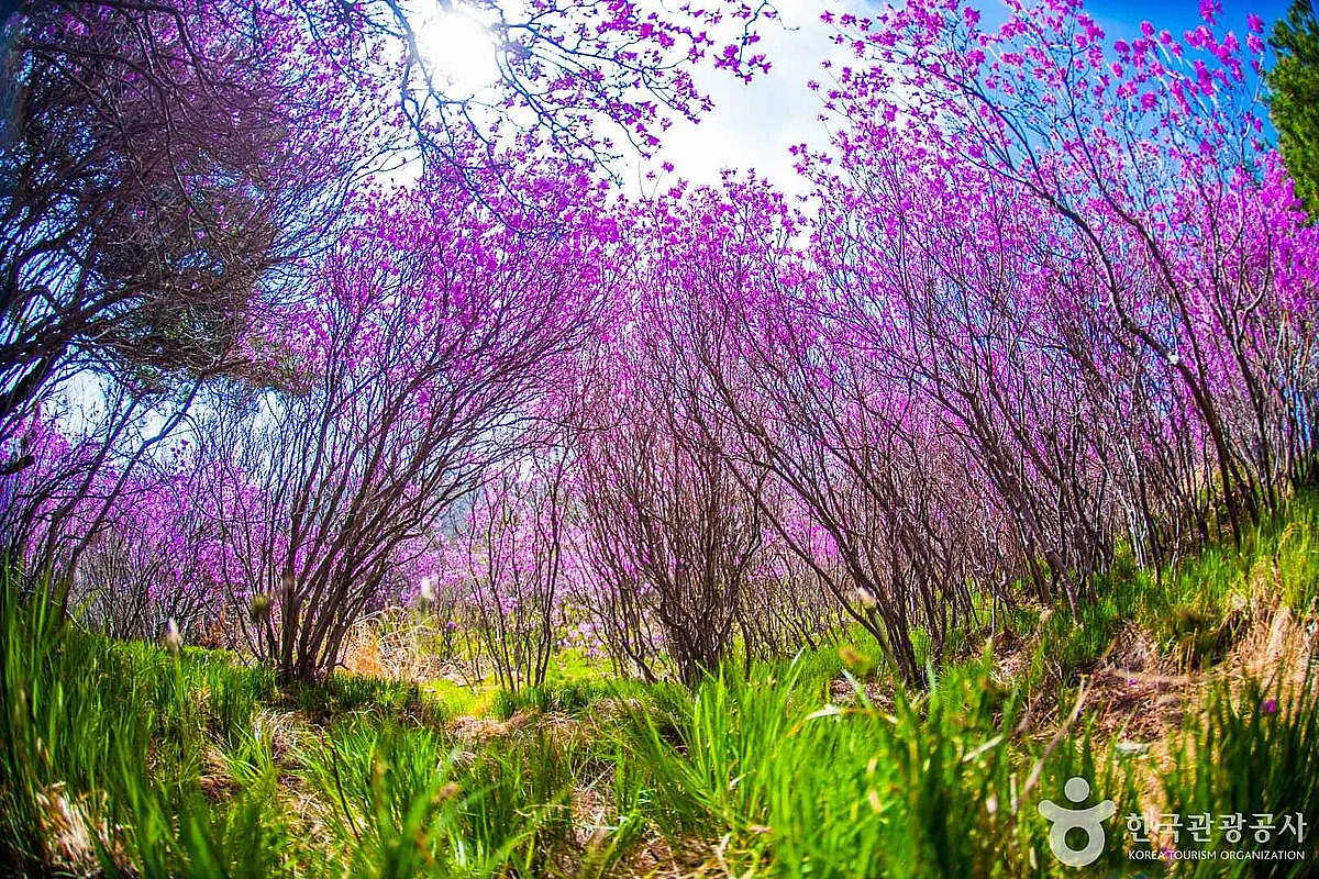 대구 지역을 대표하는 명산 비슬산은 봄이 되면 유난히 많은 인파를 불러모은다. 해발 1,000m 고지에 펼쳐진 100만㎡ 규모의 진달래 군락은 전국에서도 손에 꼽히는 스케일로, 분홍빛 물결이 거대한 카펫처럼 펼쳐진다.