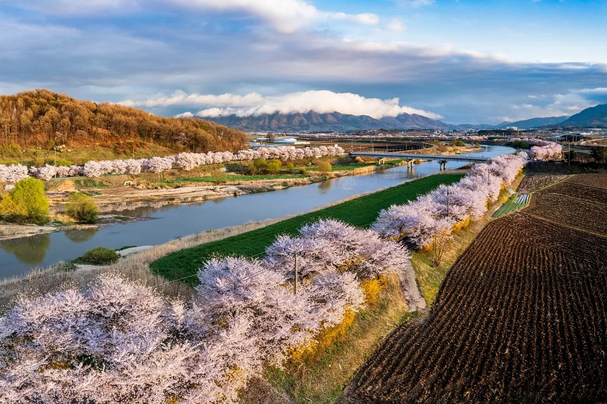 보은군 보청천을 따라 수령 20~30년 된 벚나무 4천300여 그루가 줄지어 서 있다. 꽃잎들이 터널처럼 오랜 거리를 뒤덮어, 마치 분홍색 구름을 걷는 듯한 기분을 느낄 수 있다. 특별히 이곳은 자동차 진입이 안 되므로, 사람들은 걸어서 혹은 자전거로 천천히 이동하며 벚꽃 사이를 자유롭게 누빈다. 힐링을 목적으로 찾는 방문객에겐 더없이 좋은 환경이다.